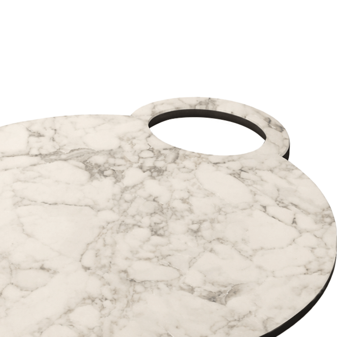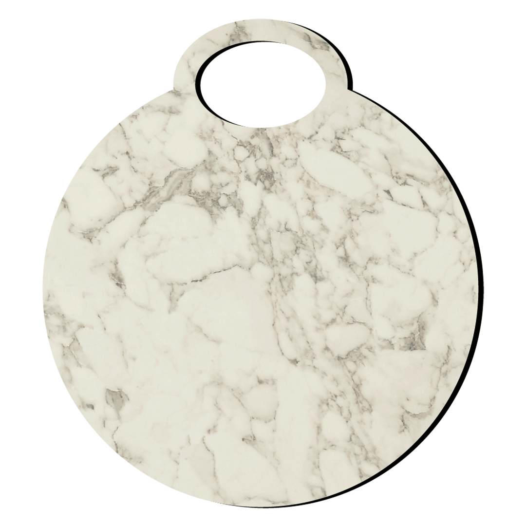 Its rounded silhouette with integrated grip handle ensures comfortable handling, easy lifting & space-efficient storage. The marble-inspired décor delivers a timeless, premium look while retaining the practical advantages of an engineered surface—unlike natural stone or wood, it does not absorb juices, odors or moisture.
