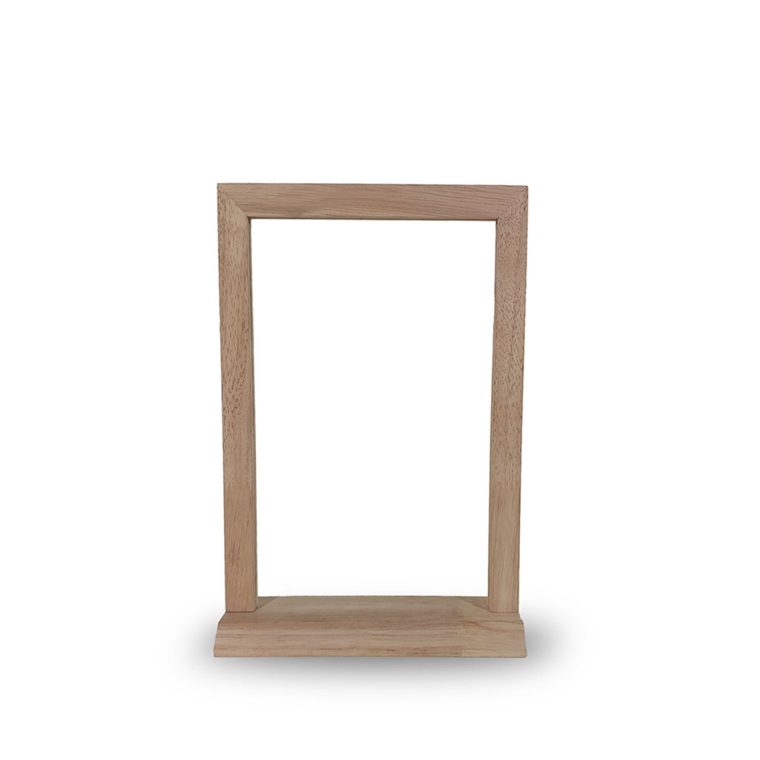 A framed tabletop menu display with a solid wooden base, designed for clear, upright presentation of menus and tabletop information.