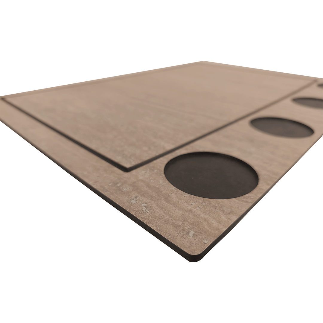 Manufactured from HPL compact laminate, the platter delivers a non-porous, hygienic & moisture-resistant surface, ensuring ease of cleaning & long-lasting performance. The precisely engineered grooves help contain crumbs & spills, while the recessed circular details add both visual interest & functional placement support.